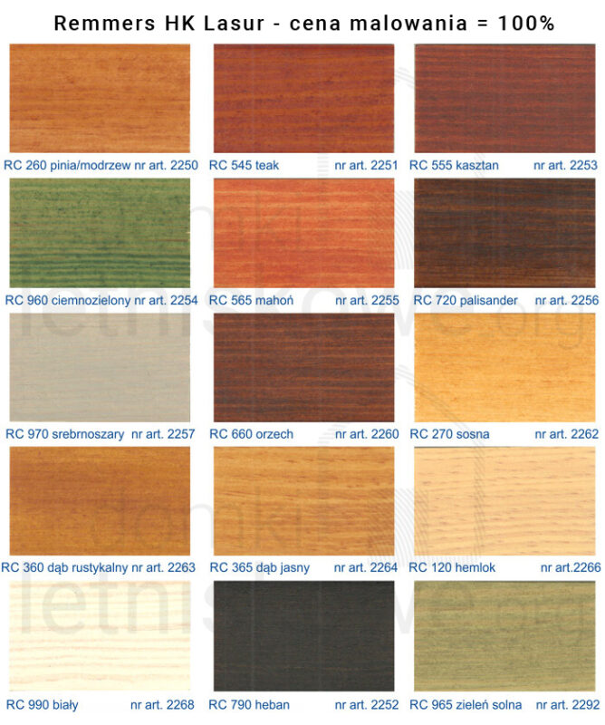 Standardowym malowaniem jest jednokrotne malowanie zewnętrzne preparatem Remmers HK Lasur. Malowanie należy odświerzyć po kilku miesiącach nakładając kolejną warstwę farby. Paleta kolorów malowania HK-Lasur jest zbliżona do różnych gatunków drewna, po nałożeniu lasur uwydatnia strukturę drewna podkreślając jego charakter. Farby HK-Lasur chronią przed sinizną, zgnilizną, pleśnią, algami, insektami, promieniowaniem UV i wilgocią. Farba nie pęka i się nie łuszczy, głęboko wnika dając naturalny matowy efekt.