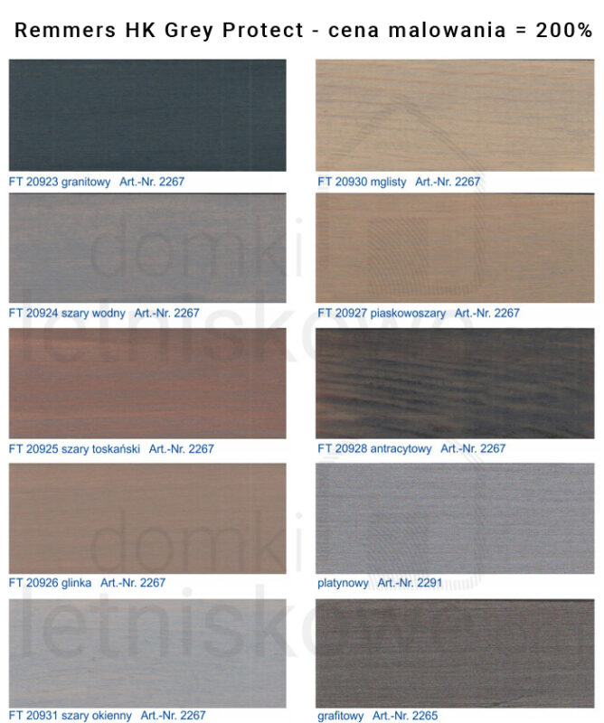 Drugim rodzajem malowania jest malowanie preparatem Remmers HK Lasur Grey Protect. Paleta zawiera w sobie różne odcienie szarości, od zwykłej farby HK-Lasur różni się tym, że malowanie od razu należy wykonać dwukrotnie. Ze względu na swój charakter po jednokrotnym malowaniu kolor nie wygląda korzystnie. Malowanie preparatem kosztuje dwa razy więcej niż malowanie podstawowym preparatem HK-LASUR. Farba ma takie same właściwości jak zwykły HK-Lasur.