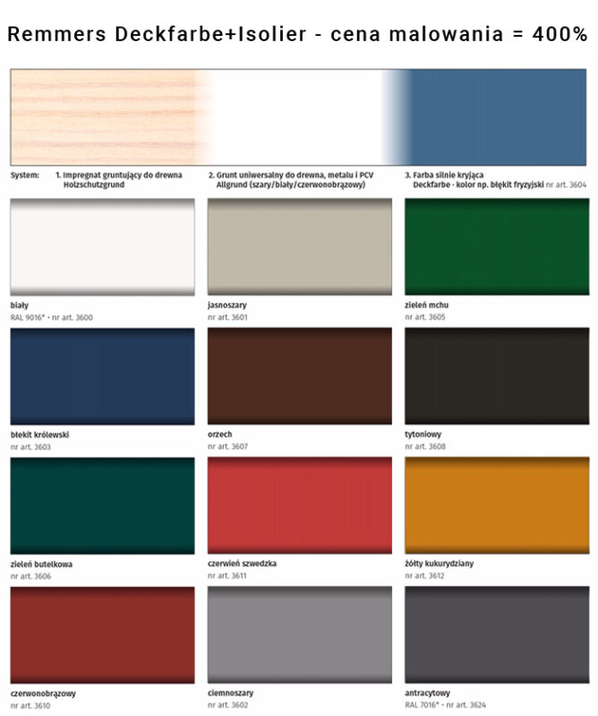 Ostatnim rodzajem malowania jest malowanie farbami Remmers Isoliergrund + Remmers Deckfarbe. Jest to malowanie w pełni kryjące, które całkowicie zakrywa strukturę drewna. Malowanie wykonuje się 3-warstwowo, najpierw nakłada się 1-2 warstwy Remmers Isoliergrund, następnie 1-2 warstwy Remmers Deckfarbe, jest to zależne od wybranego koloru. Malowanie wymaga dużo więcej czasu niż malowanie preparatami HK-Lasur, jego cena wynosi 400% ceny malowania podstawowym preparatem. Ta silnie kryjąca farba tworzy elastyczną powierzchnię, która się nie złuszcza, dając efekt jedwabistego matu.