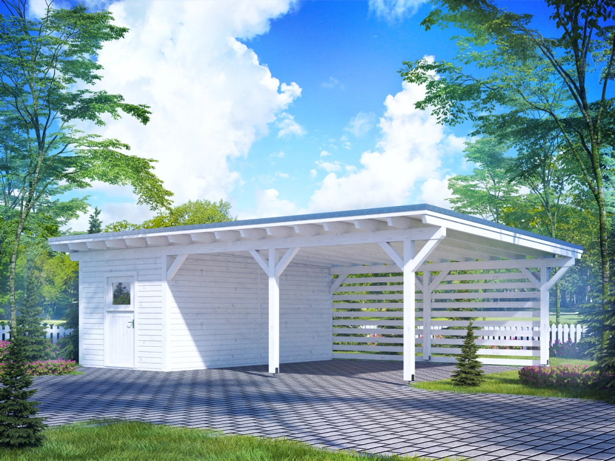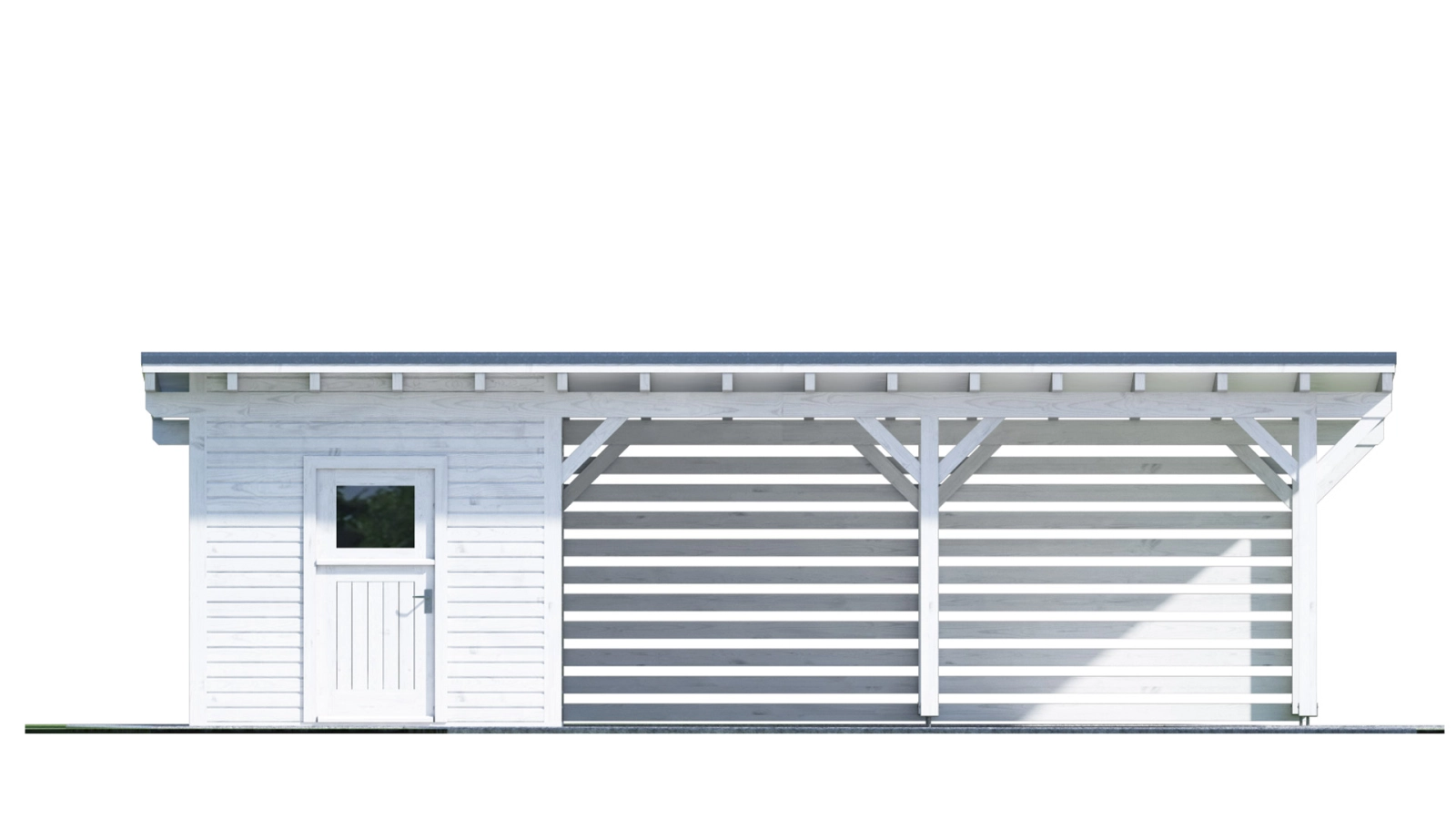 Drewniana Wiata Idaho z płaskim dachem i półotwartą przestrzenią pozwala znakomicie wykorzystać i rozszerzyć funkcjonalność przydomowej przestrzeni. Powierzchnia zadaszenia swobodnie pomieści dwa samochody osobowe lub samochód wraz z przyczepą, natomiast pomieszczenie umieszczone obok można wykorzystać jako schowek na akcesoria samochodowe. Wymiary wiaty pozwalają na budowę bez zezwoleń.