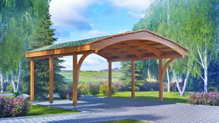 Dwustanowiskowa drewniana wiata garażowa Texas II bardzo dobrze będzie pełnić swoją rolę przy domu jednorodzinnym. Powierzchnia zabudowy wynosząca około 30 m2 umożliwia budowę bez zezwolenia budowlanego.