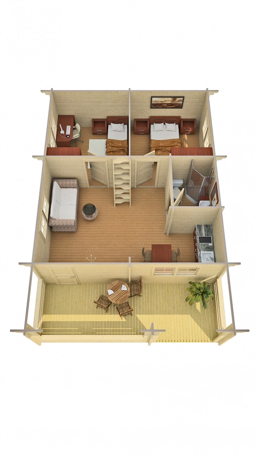 Drewniany domek z antresolą i dwoma sypialniami Europa doskonale sprawdzi się w roli domku letniskowego. Powierzchnia zabudowy domku jest równa 56,5 m2 co sprawia, że wybudować go można tylko z pozwoleniem na budowę.