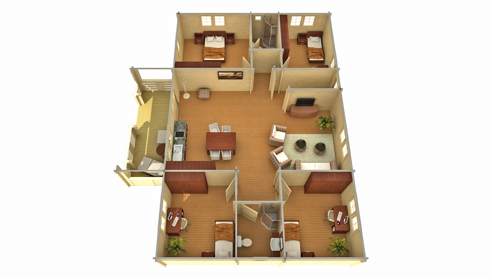 Z przodu budynku znajduje się taras 11,7 m2, duże dwuskrzydłowe drzwi wejściowe oraz trzy dwuskrzydłowe okna. Na lewej, tylnej i prawej ścianie znajdują się po dwa okna dwuskrzydłowe i jedno okno jednoskrzydłowe. Dodatkowo, z tyłu domku umieszczone zostały dodatkowe jednoskrzydłowe drzwi wejściowe. Oprócz dwóch niewielkich jednoskrzydłowych okien wszystkie okna są uchylno-rozwierane. Okna i drzwi zostały podwójnie przeszklone, co daje bardzo dobre parametry izolacyjne, dodatkowo każde drzwi wejściowe do budynku posiadają stalowy próg. Wnętrze składa się z siedmiu pomieszczeń i niewielkiego przedpokoju 4,3 m2 prowadzącego do tylnych drzwi. Główne, prowadzące do pozostałych pomieszczenie ma 44 m2 powierzchni. Cztery sypialnie 11,4 m2, 13 m2, 13 m2 i 16,2 m2 zostały umieszczone w rogach budynku, a największa z nich ma wydzielony mniejszy pokój 4,1 m2, który może stanowić łazienkę lub garderobę. Ostatnim pomieszczeniem jest pokój o powierzchni 4,8 m2 bardzo dobrze sprawdzi się w roli łazienki. Finlandia to drewniany domek, który doskonale sprawdzi się jako duży domek dla gości, na letnie lub zimowe wyjazdy dużej rodziny lub grupy przyjaciół. Razem z domkiem oferujemy pełen pakiet usług dodatkowych, w tym montaż, malowanie, pokrycie dachu i ocieplenie.