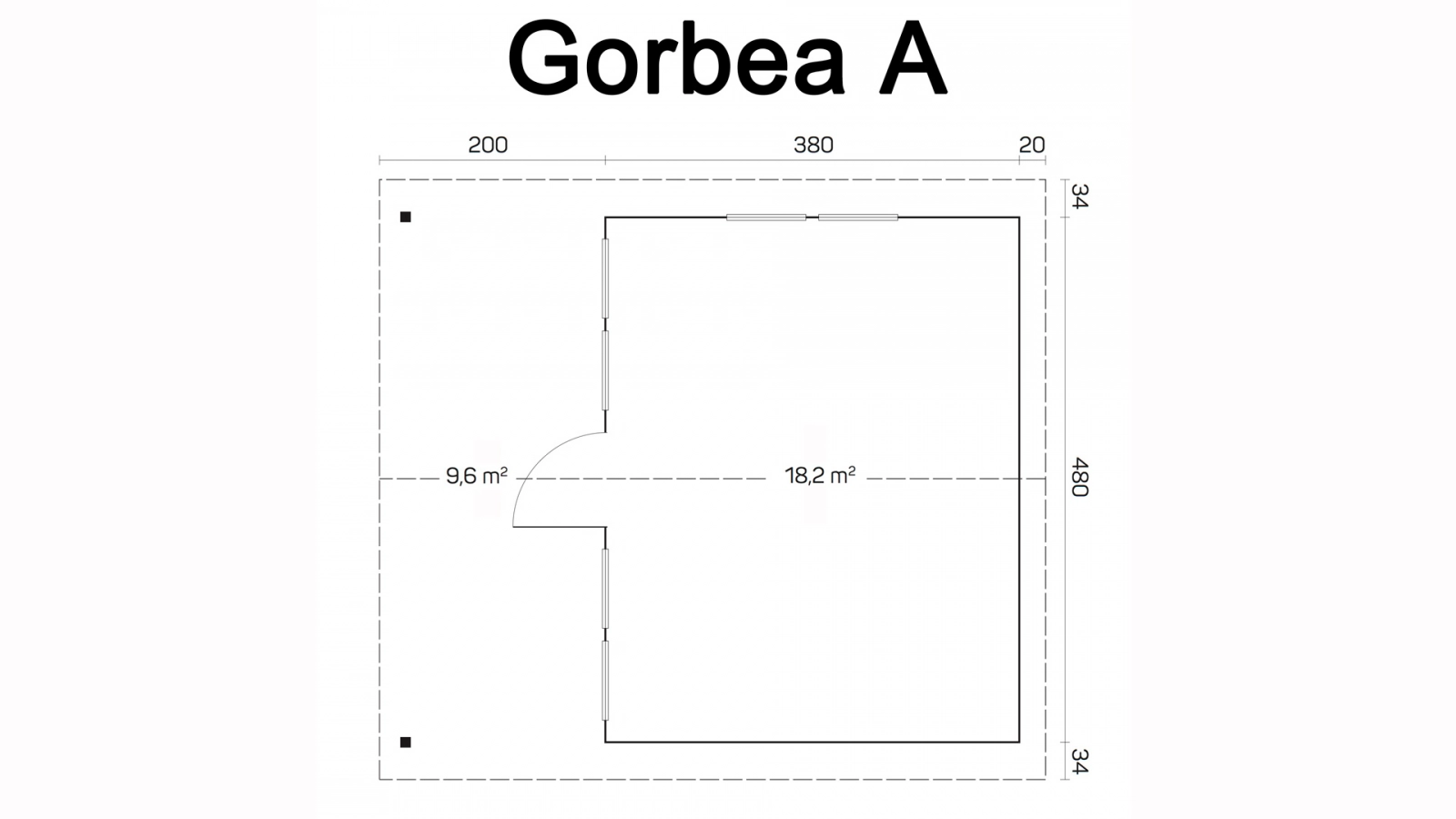 Wymiar zewnętrzny domku bez wystających wypustów ścian i wypustu dachu jest równy 480×380 cm, doliczając wypusty 500×400 cm. Wysokość w najwyższym punkcie to 268 cm, a ściany są wysokie na 217 cm. Ściany domku tak samo jak pozostałe elementy konstrukcyjne są wykonane z litego bala świerkowego i mogą mieć grubość 58 lub 70 milimetrów. Dach jest dwuspadowy, ma 33,36 m2 powierzchni i 12o nachylenia. Gorbea A jest dostępny w wersji bez podłogi, jak i z podłogą o grubości 18 i 28 mm.