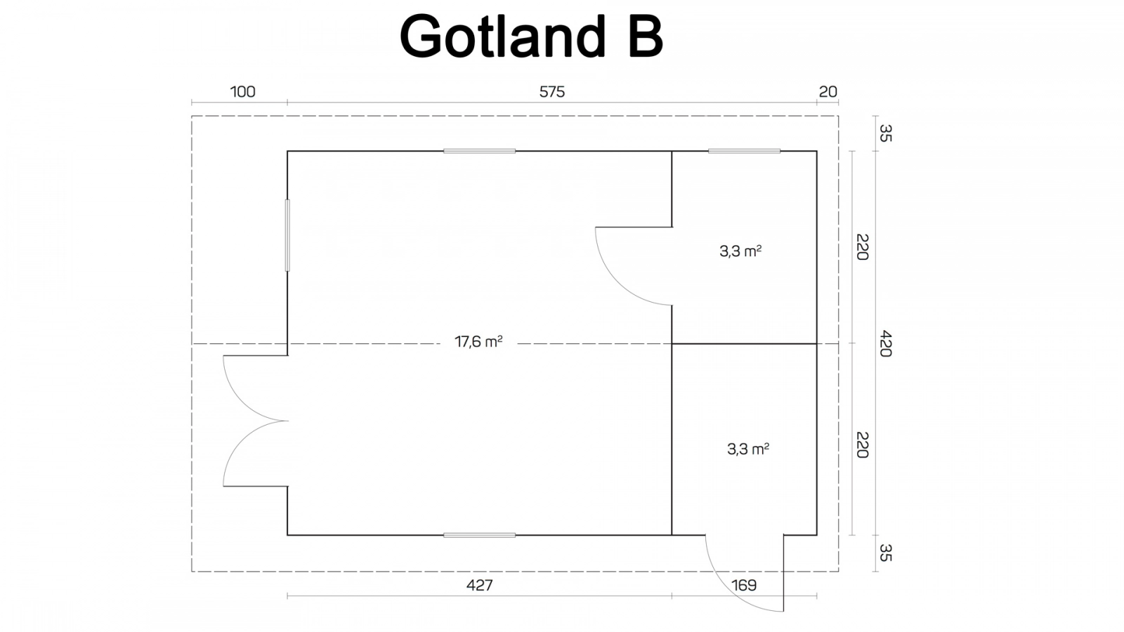 Drewniany trzypokojowy drewniany domek letniskowy Gotland B świetnie sprawdzi się na działce letniskowej lub ROD. Niewielka powierzchnia zabudowy umożliwia budowę bez pozwolenia budowlanego.