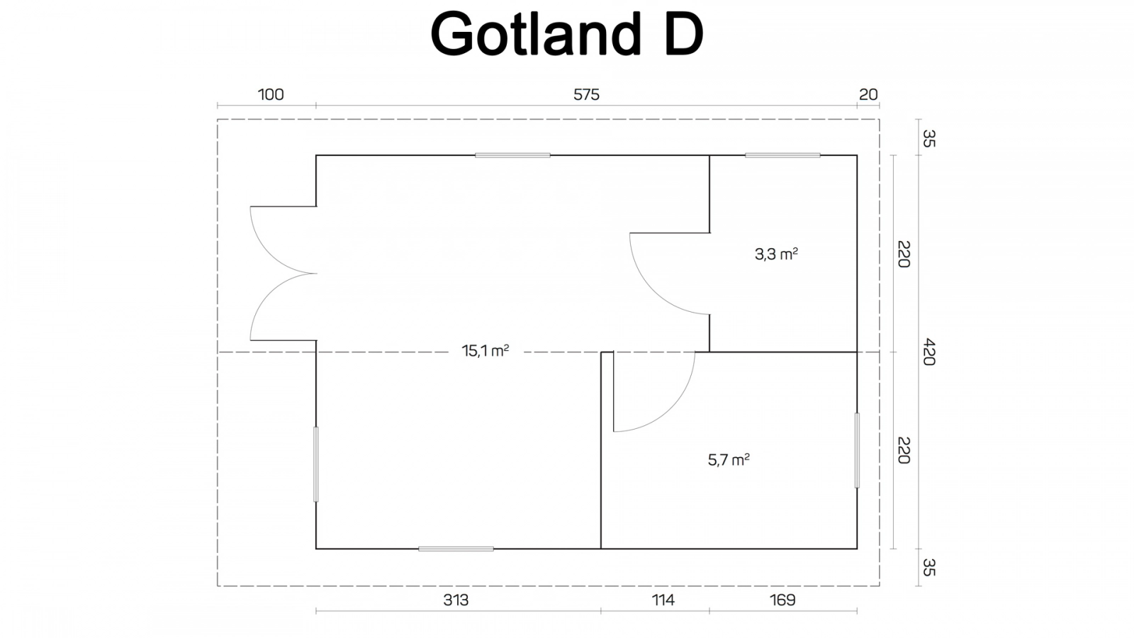 Wnętrze ma kubaturę 57,5 m3 i składa się z trzech połączonych ze sobą pokoi. Największe pomieszczenie ma 15,1 m2 powierzchni i najczęściej urządza się w nim pokój dzienny lub sypialnię. Najmniejsze pomieszczenie ma 3,3 m2 powierzchni, i najczęściej przeznacza się je na łazienkę. Średnie pomieszczenie ma 5,7 m2 i będzie doskonałe jako kuchnia i jadalnia zarazem. Gotland D posiada jedne dwuskrzydłowe drzwi wejściowe oraz jednoskrzydłowe drzwi prowadzące do każdego z pokoi. Domek posiada pięć uchylno-rozwieranych jednoskrzydłowych okien typu ECO. Do domku oferujemy wszystkie usługi dodatkowe, łącznie z ociepleniem, które uczyni z niego budynek całoroczny.
