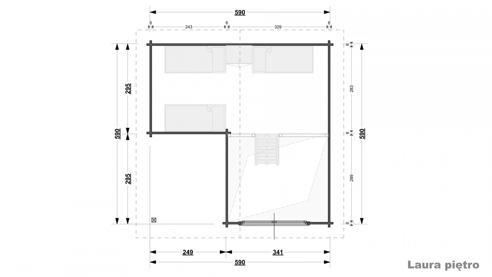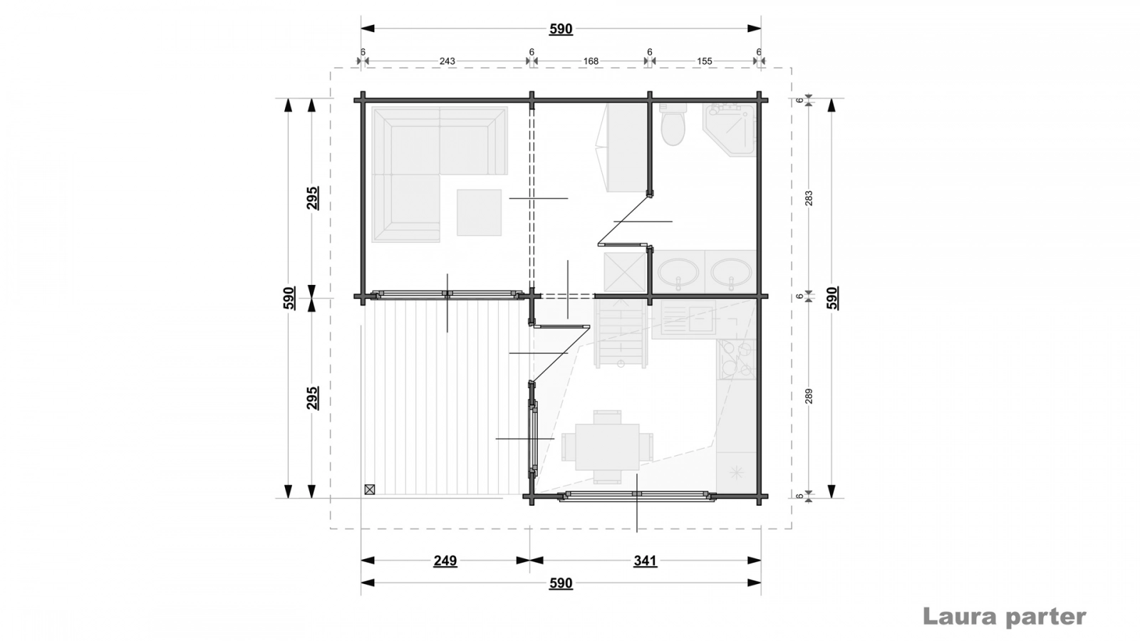 Laura zbudowana jest w całości ze świerku skandynawskiego, ma powierzchnię parteru równą 27,6 m2 oraz wymiary zewnętrzne bez wypustów 590×590 cm. Dwuspadowy, przykrywający zarówno domek jak i taras dach ma powierzchnię 60,7 m2, 40-sto stopniowy kąt nachylenia oraz został poszyty deską dachową o grubości 19 mm. Deska podłogowa wewnątrz jak i tarasowa mają grubość 28 mm, co zapewnia odpowiednią stabilność. Ściany parteru mają wysokość 255 cm, a cały domek mierzy w kalenicy 585 cm. Antresola domku ma wymiary 590×295 cm, a 295×249 cm i powierzchnię 7,25 m2.