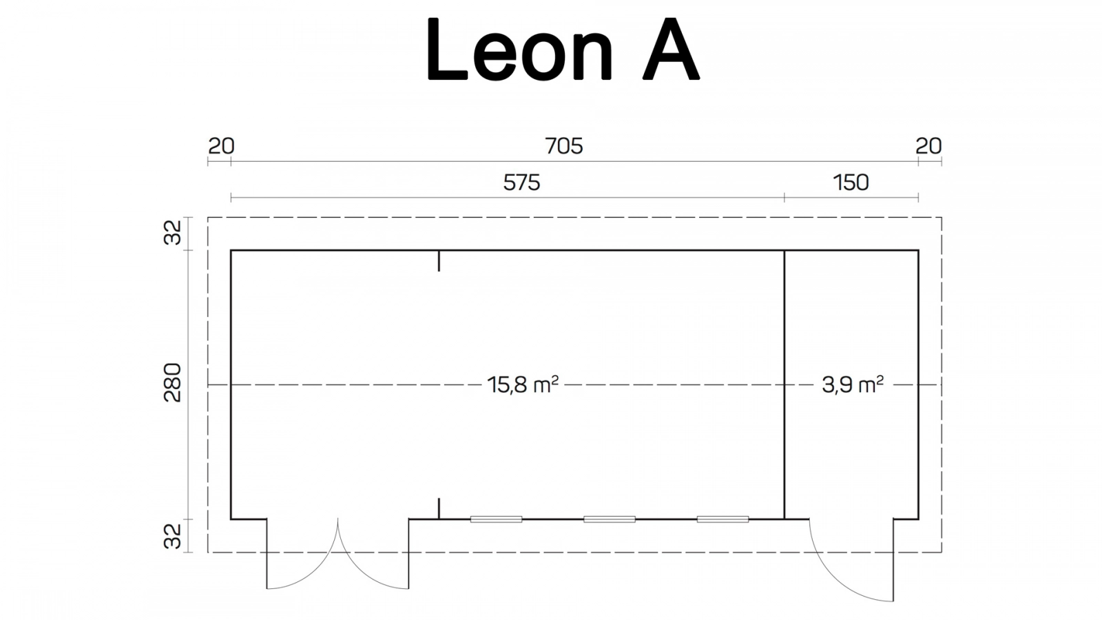 Leon A składa się z dwóch pomieszczeń z osobnymi wejściami od zewnątrz budynku. Pierwsze pomieszczenie ma 15,8 m2 i prowadzą do niego dwuskrzydłowe drzwi wejściowe. Drugie pomieszczenie ma 3,9 m2 i można wejść do niego za pomocą jednoskrzydłowych częściowo przeszklonych drzwi. Domek posiada trzy wykonane w technologii ECO okna stałe znajdujące się na przedniej ścianie. Większy pokój można przeznaczyć na pokój gościny z aneksem kuchennym, a mniejsze na schowek na rowery. Do domku oferujemy pełen pakiet usług dodatkowych w tym montaż i pokrycie dachu gontem bitumicznym.
