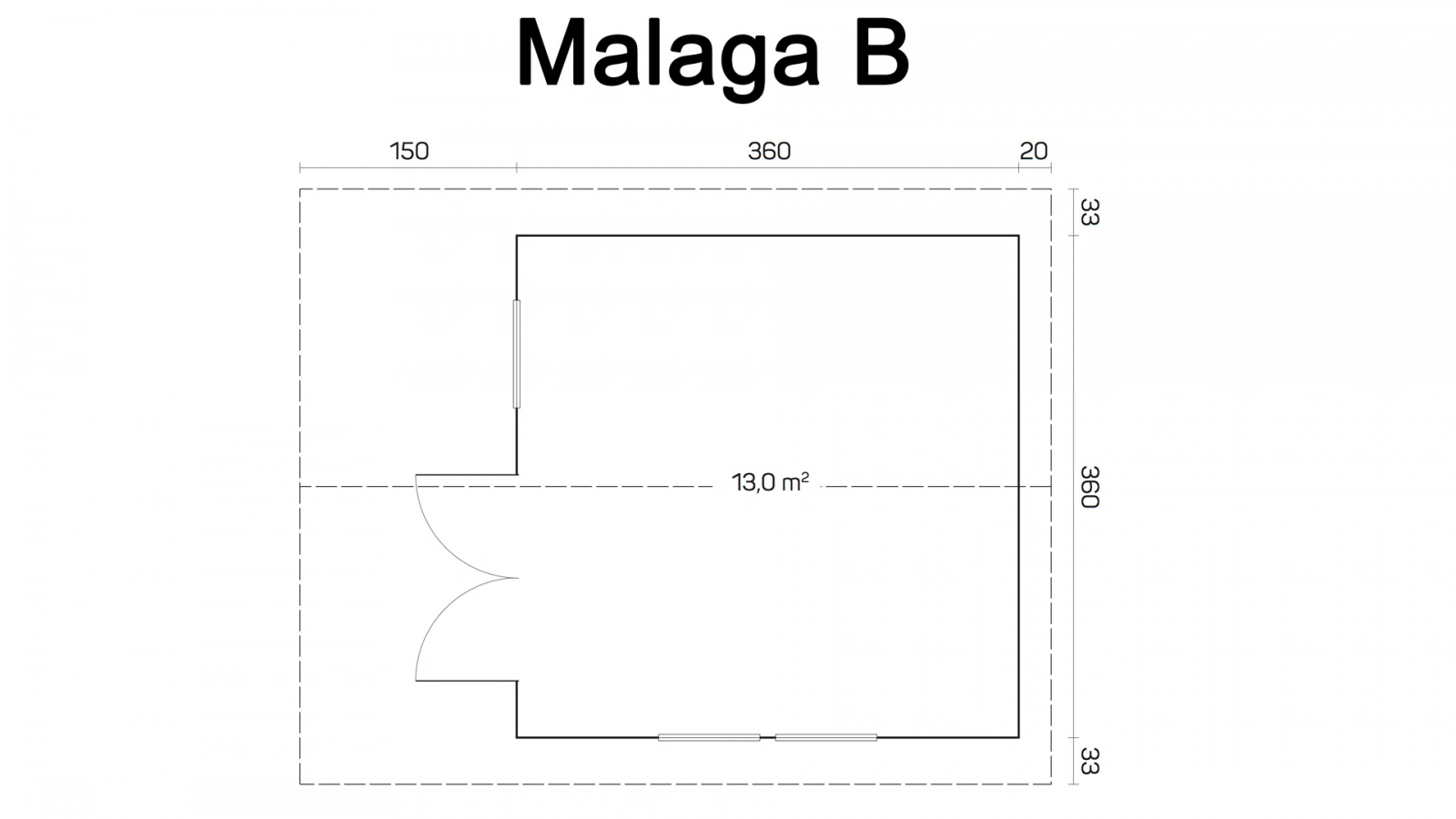 Na zewnątrz Malaga B ma 380×380 cm razem z wystającymi elementami konstrukcyjnymi, bez 360×360 cm. Dwuspadowy dach ma 23 metry kwadratowe powierzchni, grubość 18 mm i 16-stopniowe nachylenie. Domek występuje w wersjach ze ścianami o grubości 58 i 70 mm, bez podłogi lub z podłogą o grubości 18 ora 28 mm. Ściany mają wysokość 205 cm, a wysokość domku w najwyższym punkcie wynosi 257 cm. Prosta konstrukcja i doskonale dopasowane elementy konstrukcyjne pozwalają na bezproblemowy montaż domku.