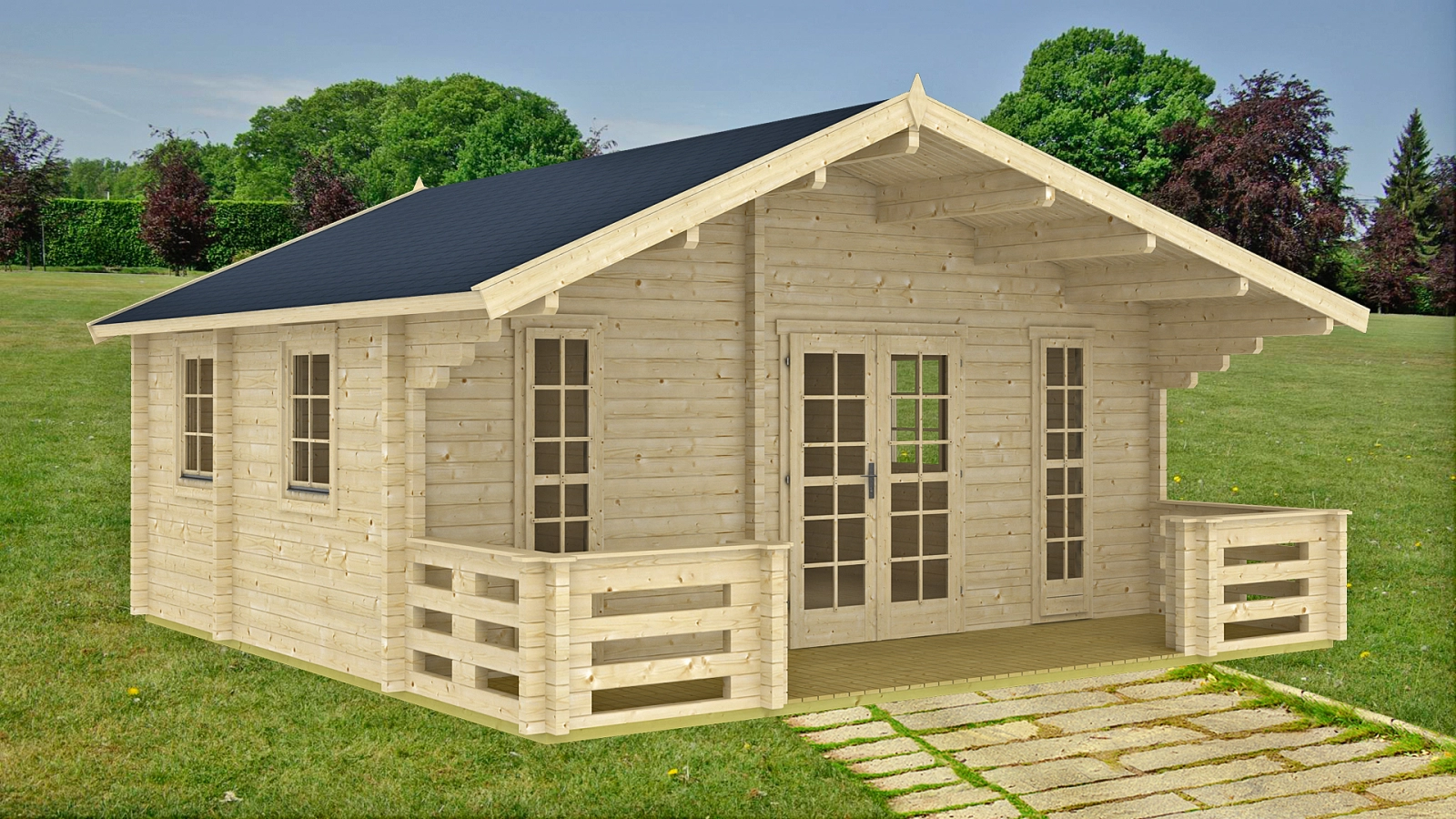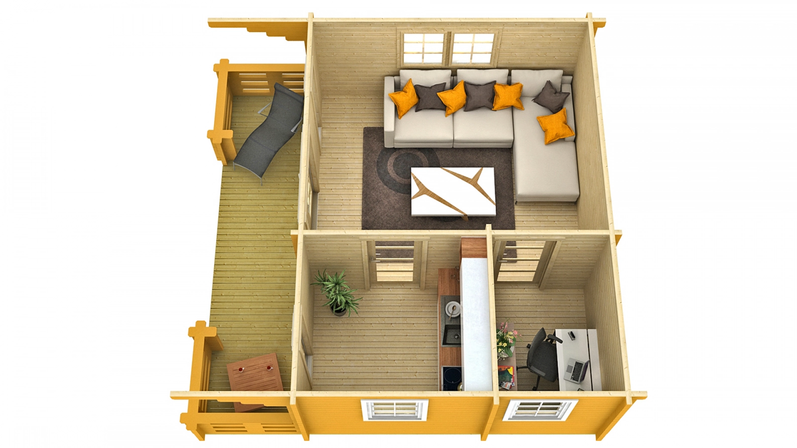 Drewniany domek Monviso będzie doskonały w roli domku letniskowego na działce rekreacyjnej lub domku w Rodzinnych Ogrodach Działkowych. Równa 24,4 m2 powierzchnia zabudowy sprawia, że Monviso można wybudować bez pozwolenia budowlanego.