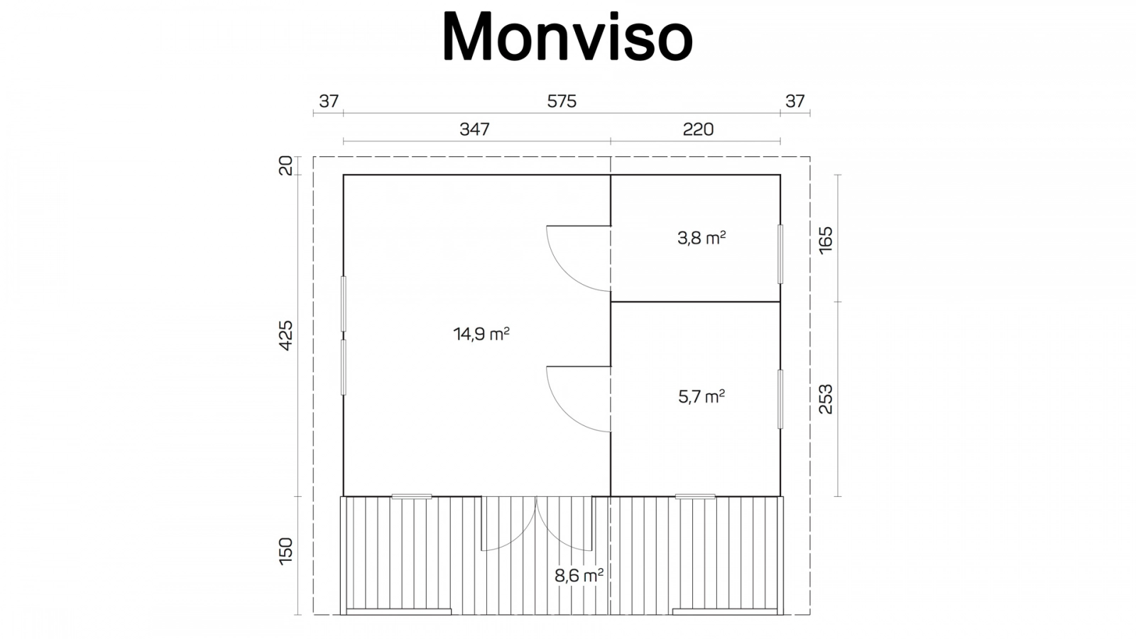 Wymiar zewnętrzny domku razem z wypustami to 595×445 cm, bez wypustów 575×425 cm. Razem z tarasem i wypustami Monviso mierzy 595×595 cm. W najwyższym punkcie domek ma 313 cm, a ściany są wysokie na 217 cm. Ściany domku występują w grubościach 58 i 70 mm. Domek jest dostępny w wersji bez podłogi oraz w wersji z podłogą o grubości 18 i 28 mm. Dach jest dwuspadowy, ma 41,3 m2 powierzchni, 18 mm grubości i niesymetryczne nachylenie. Całość konstrukcji jest stabilna i wytrzymała, została wykonana z wysokiej klasy świerku skandynawskiego. Domek jest stawiany na impregnowanych ciśnieniowo belkach podwalinowych o profilu 60×70 mm.
