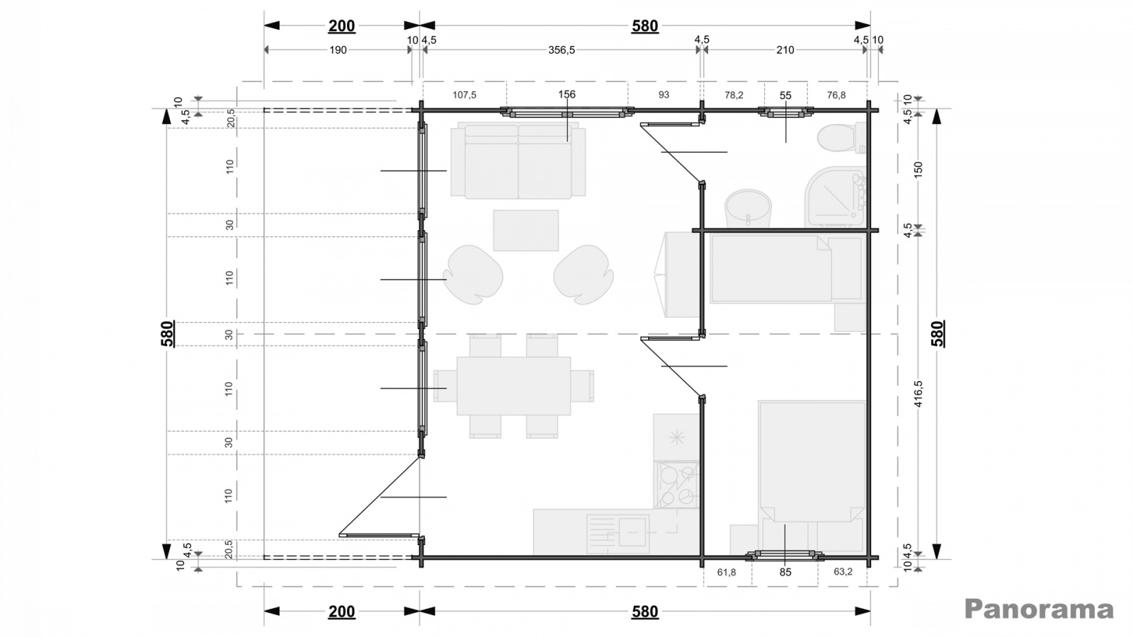 Domek zajmuje szerokość i długość 600×800 cm, z czego 580×780 cm nie licząc wypustów konstrukcyjnych. Ściany mają wysokość 225 cm oraz 325 cm w najwyższym punkcie przy zachowaniu regularnej grubości równej 45 mm. Panoramę pokrywa dwuspadowy dach o kącie opadania 15° oraz powierzchnią całkowitą wynoszącą 58 m2. Zarówno dach, jak i podłoga wykonane zostały z deski o grubości odpowiednio 19 mm oraz 28 mm. Domek w całości wykonany jest z wytrzymałego gatunkowego świerku, którego precyzyjna obróbka drewna zapewnia idealne dopasowanie kolejnych elementów do siebie oraz ułatwia późniejszą konserwację oraz malowanie.