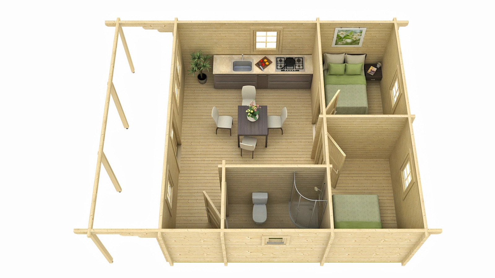 Do domku prowadzą jednoskrzydłowe drzwi wejściowe, które wraz z dwoma oknami znajdują się pod 1,5-metrowym zadaszeniem z przodu budynku. Pozostałe okna znajdują się na bokach oraz z tyłu konstrukcji. Wszystkie okna zostały wykonane w technologii ECO, co zapewnia bardzo dobrą izolację od zewnętrznych warunków atmosferycznych. Wnętrze jest podzielone na cztery pomieszczenia, z czego największe o powierzchni 17,7 m2 jest pokojem przechodnich do pozostałych pomieszczeń. Kolejne dwa pomieszczenia mają po 5,9 m2 powierzchni, a ostatnie 3,7 m2. We wnętrzu domku można urządzić dwie sypialnie, łazienkę i pokój dzienny połączony z kuchnią. Razem z domkiem oferujemy wszystkie opcje dodatkowe łącznie z montażem, okiennicami, rynnami i malowaniem.