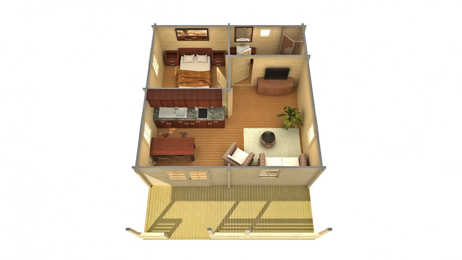 Z przodu Petry znajduje się taras o powierzchni 10,9 m2, dwuskrzydłowe częściowo przeszklone drzwi wejściowe oraz jednoskrzydłowe okno. Pozostałe okna są umieszczone na lewej i prawej stronie domku. Wnętrze jest zbudowane z trzech pomieszczeń, gdzie największe ma powierzchnię 22,4 m2 i prowadzi do pozostałych. Mniejsze pomieszczenia mają powierzchnię 9 m2 i 4,6 m2. Największe pomieszczenie można z powodzeniem zaaranżować na salon z aneksem kuchennym, średnie na sypialnię i najmniejsze na łazienkę. Razem z domkiem oferujemy montaż, pokrycie dachu, okiennice oraz wiele innych usług dodatkowych. Budynek można ocieplić czyniąc z niego domek całoroczny.