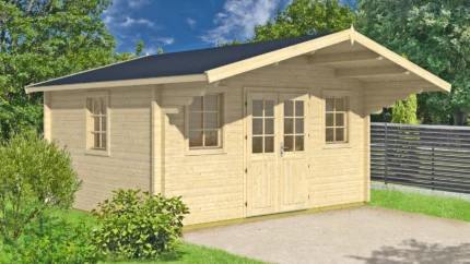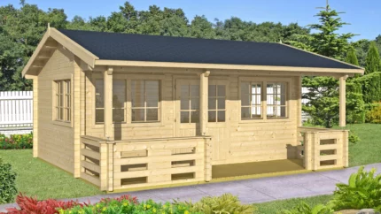 Drewniany domek letniskowy z dużym tarasem Riopas doskonale sprawdzi się jak domek na działce rekreacyjnej. Powierzchnia zabudowy wynosi 51,4 m2 i tym samym nie pozwala na budowę bez pozwolenia.