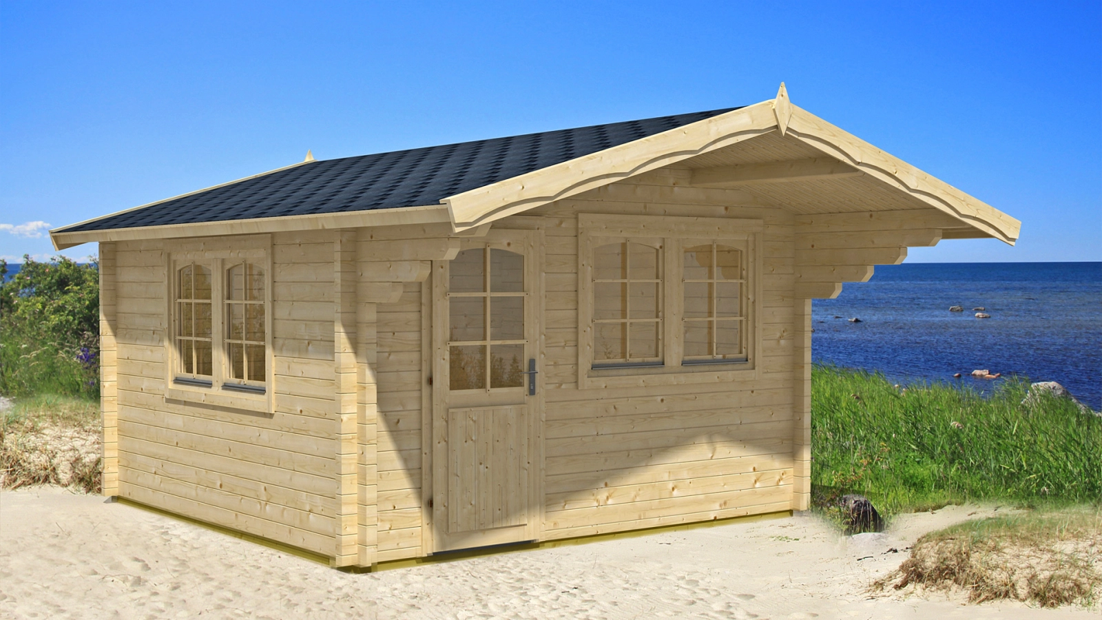 Od frontu domek ma jednoskrzydłowe przeszklone drzwi wejściowe, dwuskrzydłowe uchylno-rozwierane okno oraz 150 cm wypust dachu. Drugie dwuskrzydłowe okno znajduje się domyślnie z prawej strony budynku. Wnętrze domku umożliwia dowolną aranżację i przeznaczenie domku na biuro, domek dla gości, domek narzędziowy czy altanę w Rodzinnych Ogrodach Działkowych. Wypust dachu umożliwi ustawienie niewielkiego kompletu mebli ogrodowych i tym samym spędzanie większej ilości czasu na świeżym powietrzu. Dwa duże okna i przeszklone drzwi sprawiają, że wnętrze domku jest bardzo jasne. Do domku oferujemy pełen pakiet usług dodatkowych w tym montaż okiennic czy ułożenie rynien.