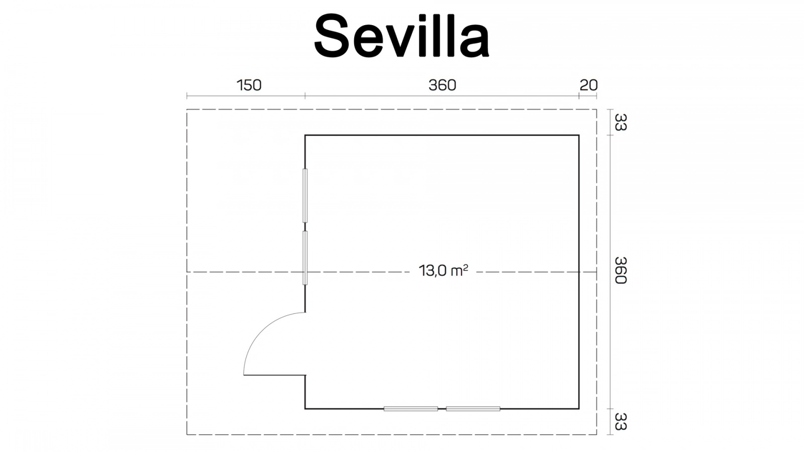 Wykonany z drewna niewielki domek letniskowy Sevilla bardzo dobrze będzie pełnił swoją rolę jako biuro lub domek dla gości. Powierzchnia zabudowy równa 13 m2 umożliwia budowę bez pozwolenia budowlanego.
