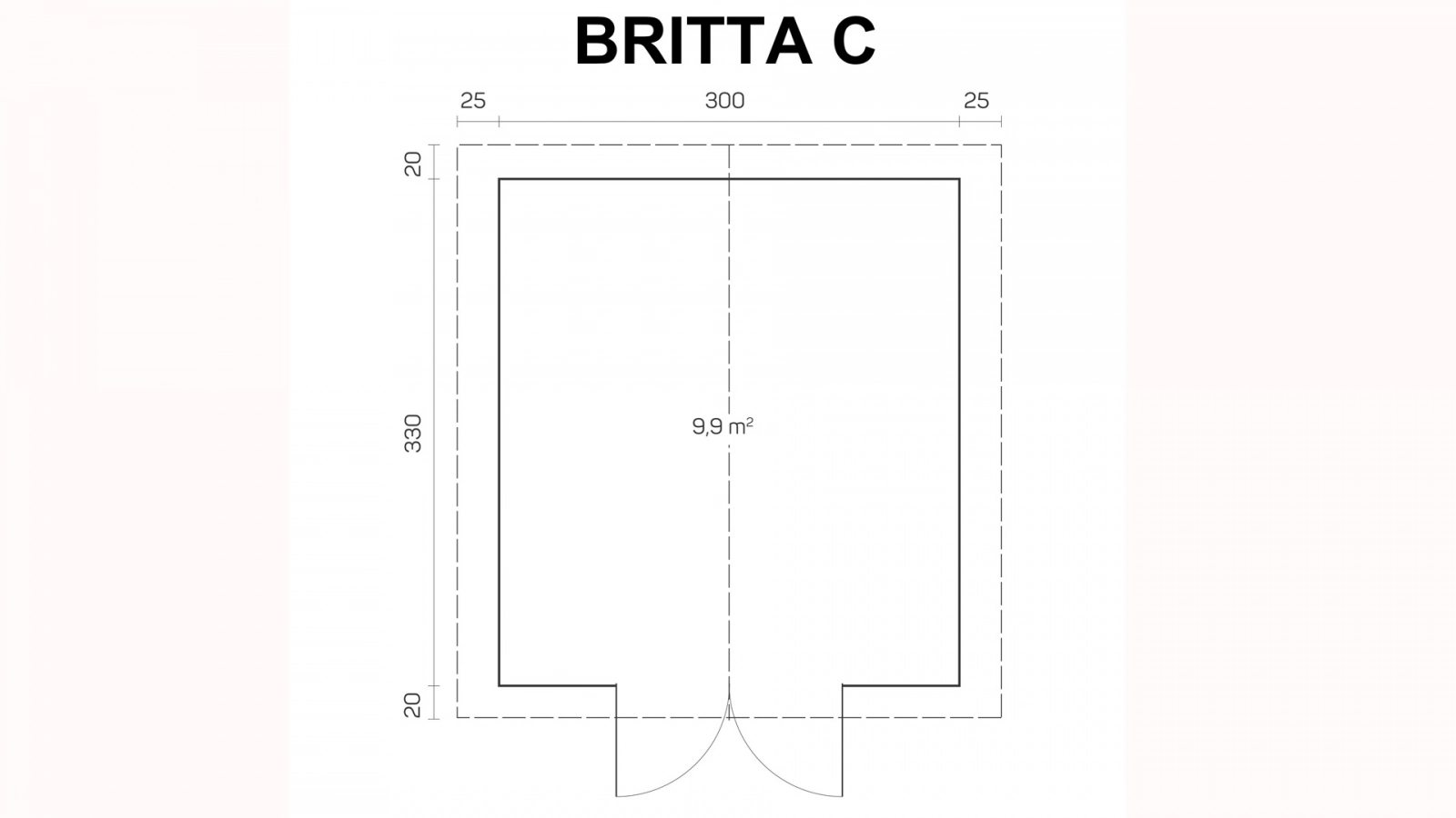 Wymiary zewnętrzne wynoszą 320×350 cm, z czego 300×330 cm przypada na powierzchnię zabudowy. Wykonane z bala świerkowego ściany o grubości 28 mm mają wysokość 194 cm. Domek w najwyższym punkcie kalenicy osiąga 234 cm wysokości. Ściany kryje dwuspadowy, pełny dach o symetrycznym 15-stopniowym spadzie oraz powierzchni całkowitej 13,5 m2. Podłogę, podobnie jak dach wykonano z deski 18 mm. Domek stawiany jest na belkach podwalinowych, które skutecznie izolują całą konstrukcję od podłoża. Precyzję wykonania i dopasowania elementów gwarantuje cyfrowa obróbka drewna, której poddany został każdy, nawet najmniejszy detal. Pozwala to na łatwy, samodzielny montaż domku Britta C.