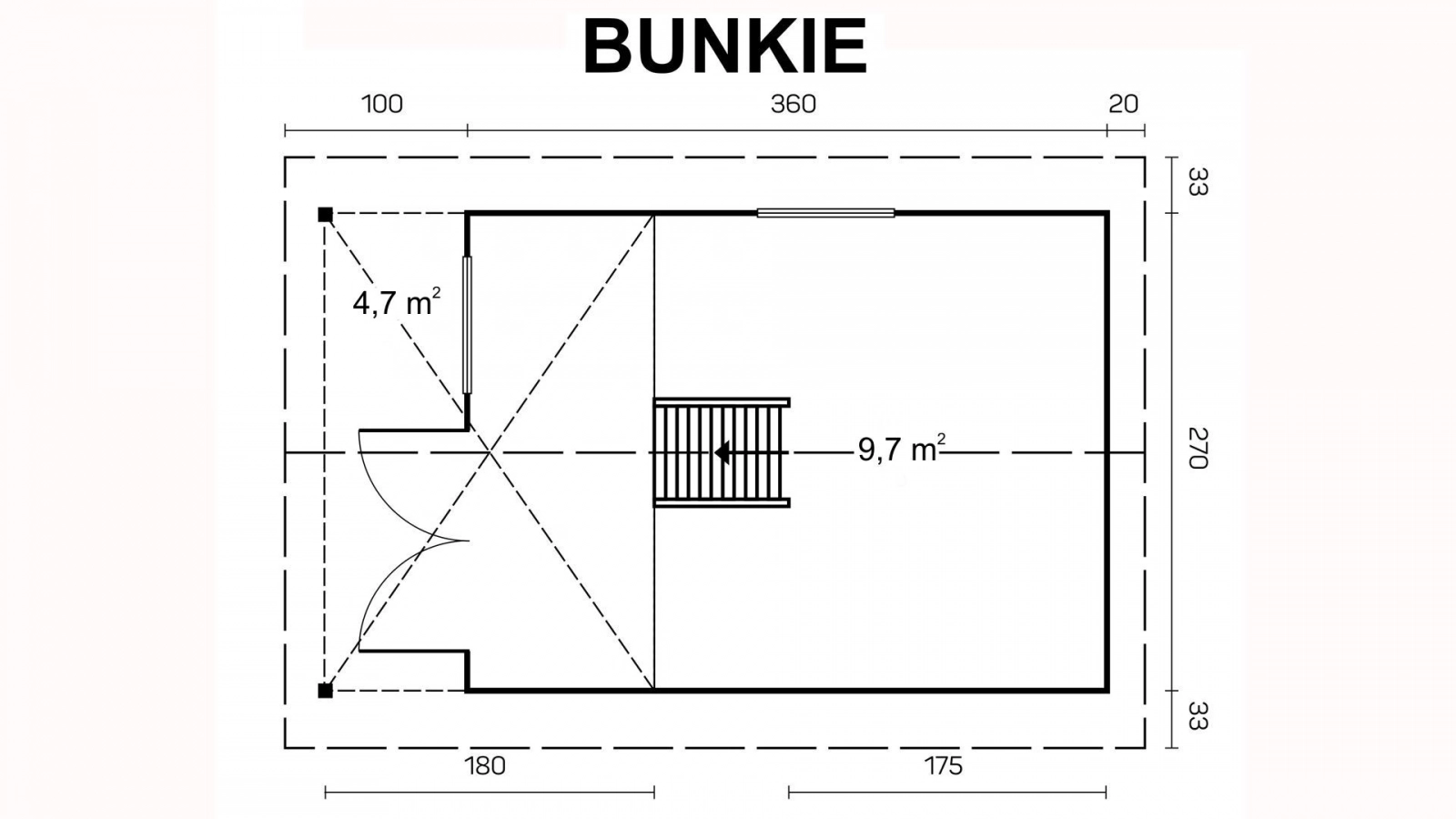 Bunkie składa się z jednego pomieszczenia o powierzchni użytkowej niemal 9,7 m2 i antresoli 4,7 m2. Z przodu budynku znajduje się 100 cm wypust dachu, podwójne częściowo przeszklone drzwi wejściowe oraz jednoskrzydłowe uchylno-rozwierane okno. Drugie okno znajduje się domyślnie z lewej strony domku. Antresolę można zaaranżować na sypialnię wstawiając do niej materac, natomiast na parterze można urządzić pokój dzienny z aneksem kuchennym. Razem z domkiem oferujemy pakiet usług dodatkowych łącznie z montażem i ułożeniem rynien.
