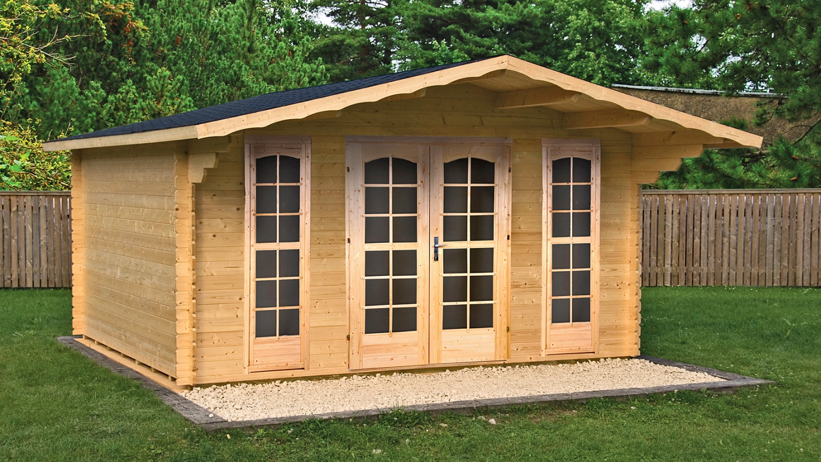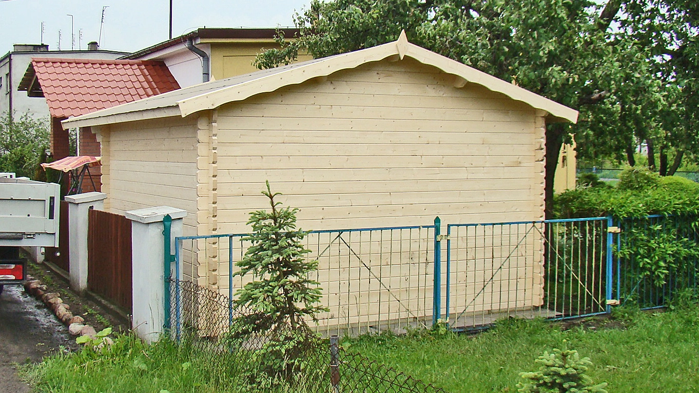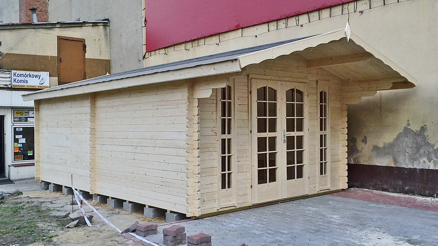 Z przodu znajduje się 125 centymetrowy wypust dachu, stanowiący zadaszenie nad wejściem. Na środku przedniej ściany są umieszczone podwójne, dodatkowo przeszklone drzwi wejściowe oraz dwa duże okna stałe. Wnętrze domku składa się z jednego pomieszczenia o powierzchni 13 m2 i kubaturze 28,6 m6. Domek bardzo dobrze będzie pełnił rolę domku dla gości lub niewielkiego biura. Do domku oferujemy niemal wszystkie usługi dodatkowe, w tym malowanie, transport i montaż.