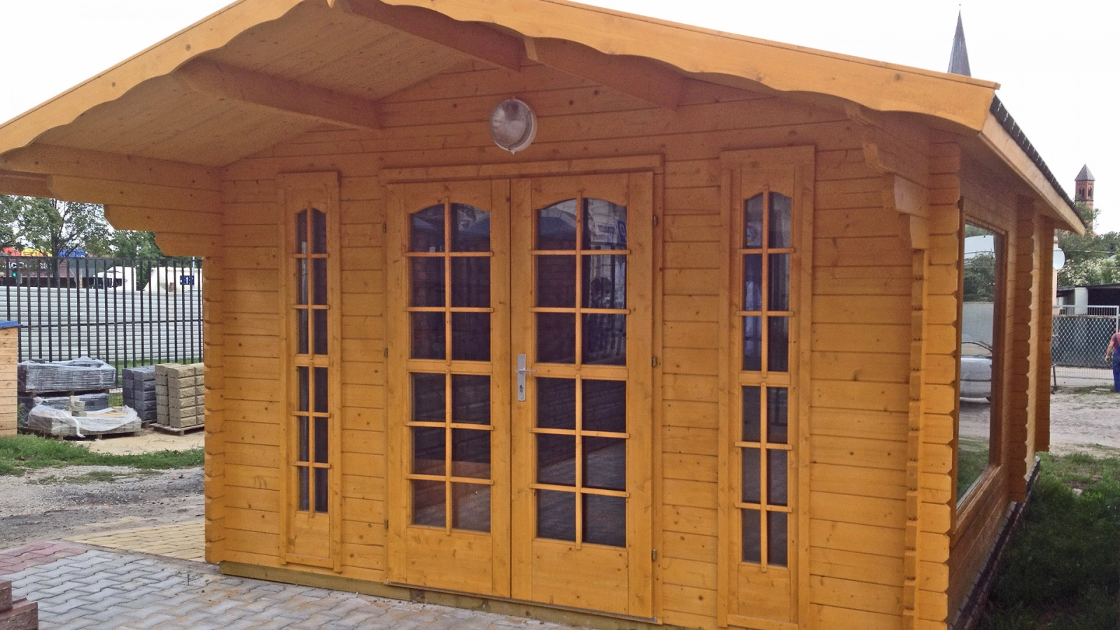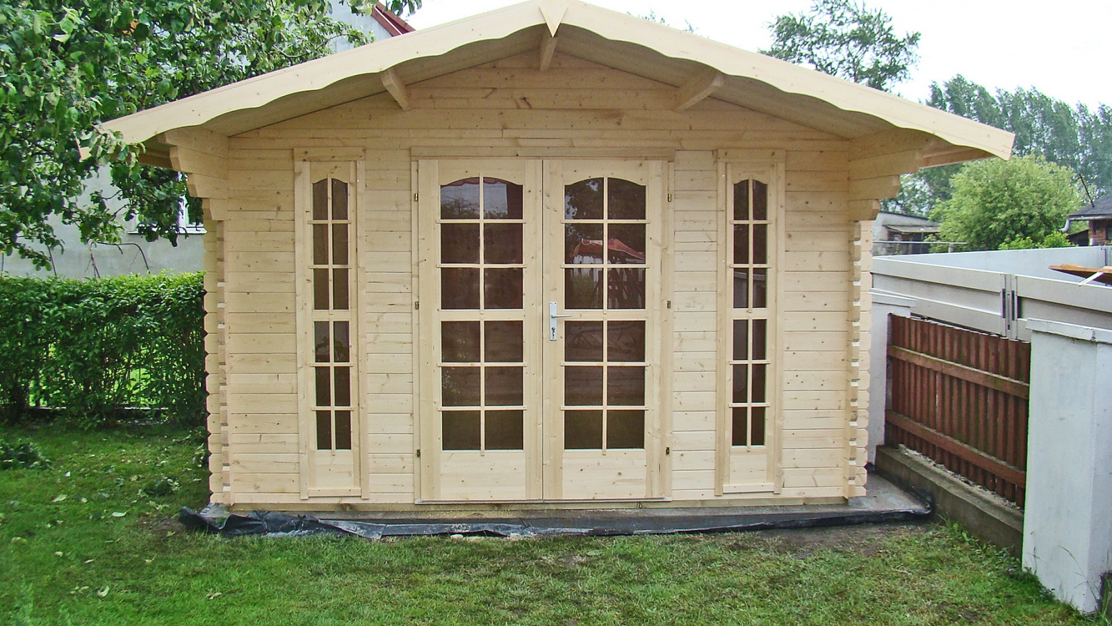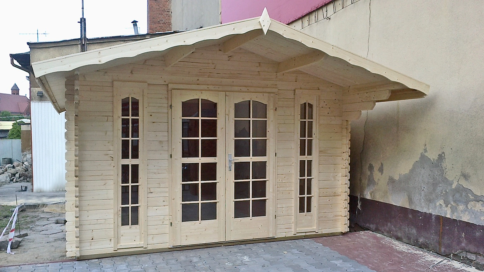 Z przodu znajduje się 125 centymetrowy wypust dachu, stanowiący zadaszenie nad wejściem. Na środku przedniej ściany są umieszczone podwójne, dodatkowo przeszklone drzwi wejściowe oraz dwa duże okna stałe. Wnętrze domku składa się z jednego pomieszczenia o powierzchni 13 m2 i kubaturze 28,6 m6. Domek bardzo dobrze będzie pełnił rolę domku dla gości lub niewielkiego biura. Do domku oferujemy niemal wszystkie usługi dodatkowe, w tym malowanie, transport i montaż.