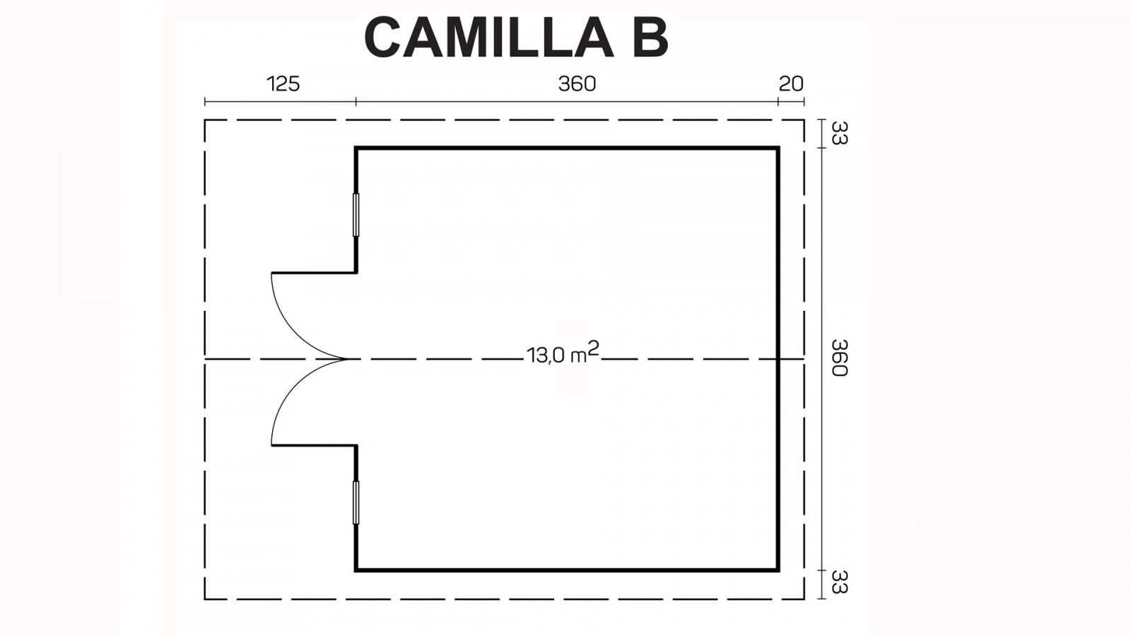 Camilla B bez wypustów mierzy 360×300 cm, doliczając wypusty ścian 360×300 cm. Konstrukcję zwiększa dwuspadowy, symetryczny dach o 16-stopniowym nachyleniu i 22 metrach kwadratowych powierzchni. Wysokość ścian jest równa 205 cm, a wysokość domku w najwyższym punkcie 257 cm. Budynek jest skonstruowany w całości z litego bala świerkowego o grubości 40 mm dla ścian, 18 mm dla podłogi i dachu. Konstrukcja jest ustawiana na impregnowanych ciśnieniowo belkach podwalinowych.
