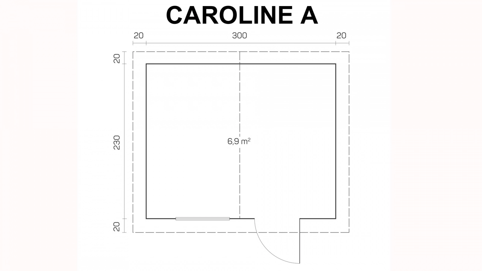 Do wnętrza prowadzą osadzone na ścianie frontowej jednoskrzydłowe, na wpół przeszklone drzwi. Caroline A składa się jednego pomieszczenia o powierzchni 6,9 m2. Wnętrze dodatkowo doświetla uchylno-rozwierane okno umieszczone obok drzwi wejściowych. Dzięki swojej symetrycznej budowie możliwe jest dopasowanie do wymagań klienta i zamienić miejscami okno z drzwiami. Razem z domkiem dostępny jest wachlarz dodatków, takich jak zastosowanie rynien, zmiana pokrycia dachu na papę lub gont, jak również zastosowanie ocieplenia. Dodatki uzupełniają usługi montażu, transportu oraz malowania.