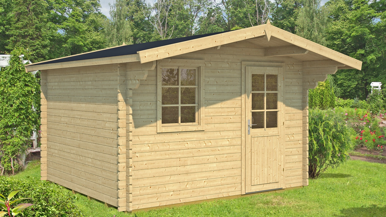 Bez wypustów domek ma 330×300 cm, a z wystającymi elementami konstrukcyjnymi mierzy 350×320 cm. Wytrzymałość i trwałość zapewniają grube na 40, 58 lub 70 milimetrów i wysokie na 205 cm ściany. Dach i podłoga są zbudowane z 18 mm świerkowej deski. W wersji ze ścianą 58 mm lub 70 mm domek występuje również bez podłogi i z podłogą o grubości 28 mm. Dwuspadowy, symetryczny dach ma 16,7 m2 powierzchni, 14o nachylenia i aż 90 cm wypustu. W szczycie domek ma wysokość 245 cm. Elementy konstrukcyjne domku zostały dopasowane dzięki cyfrowej obróbce drewna.