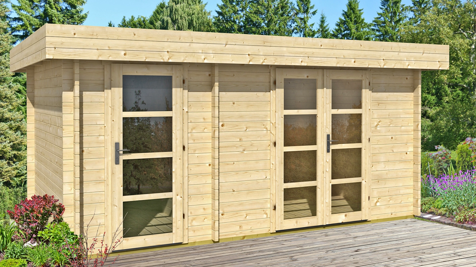 Drewniany domek ogrodowy z płaskim dachem Oriental 4 najlepiej sprawdzi się jako domek narzędziowy przy domu jednorodzinnym. Konstrukcję można wybudować bez zezwoleń.