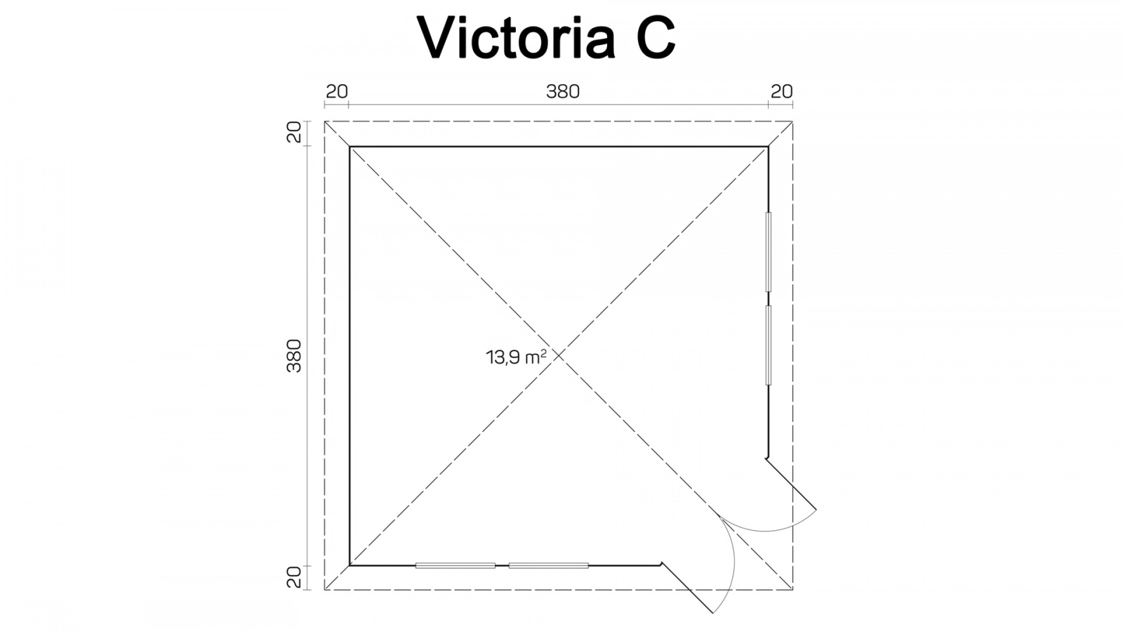 Zewnętrzny wymiar domku z wystającymi balikami świerkowymi wynosi 400×400 cm. Bez wystających elementów konstrukcyjnych długość i szerokość domku jest równa 380×380 cm, dając 13,9 m2 powierzchni użytkowej. Piramidalny dach domku o powierzchni 19,6 m2 zwieńcza ozdobna kula. Victoria C jest wykonana z litego bala świerkowego o grubości 40 mm dla ścian i 18 mm dla dachu i podłogi. Zapewnia to wysoką trwałość i stabilność konstrukcji.