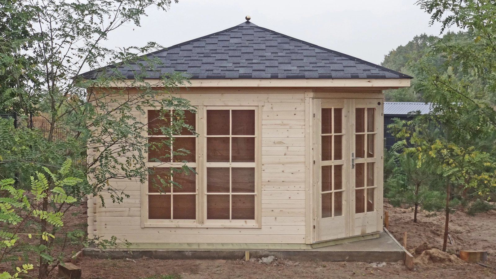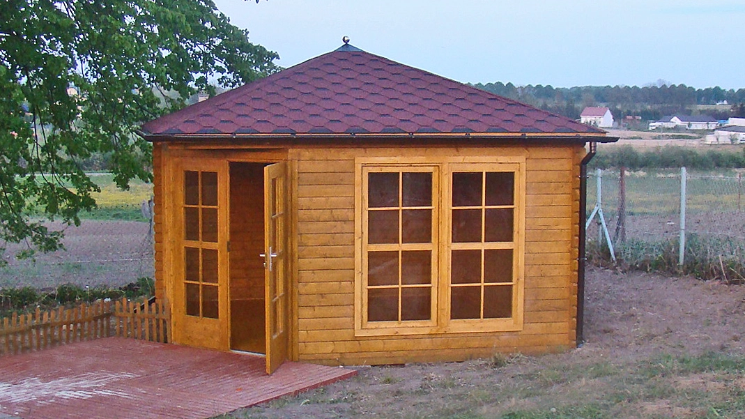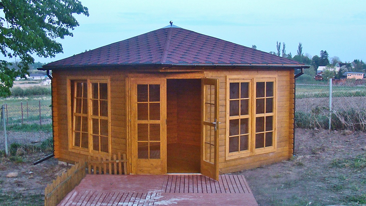 Drewniany domek pięciokątny Victoria C doskonale spełni rolę miejsca wypoczynku w zaciszu własnego ogrodu lub w ROD. Powierzchnia zabudowy daje możliwość budowy bez pozwolenia budowlanego.