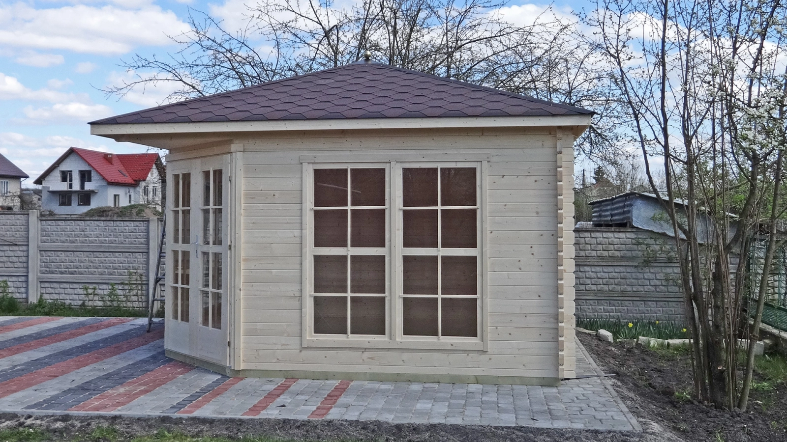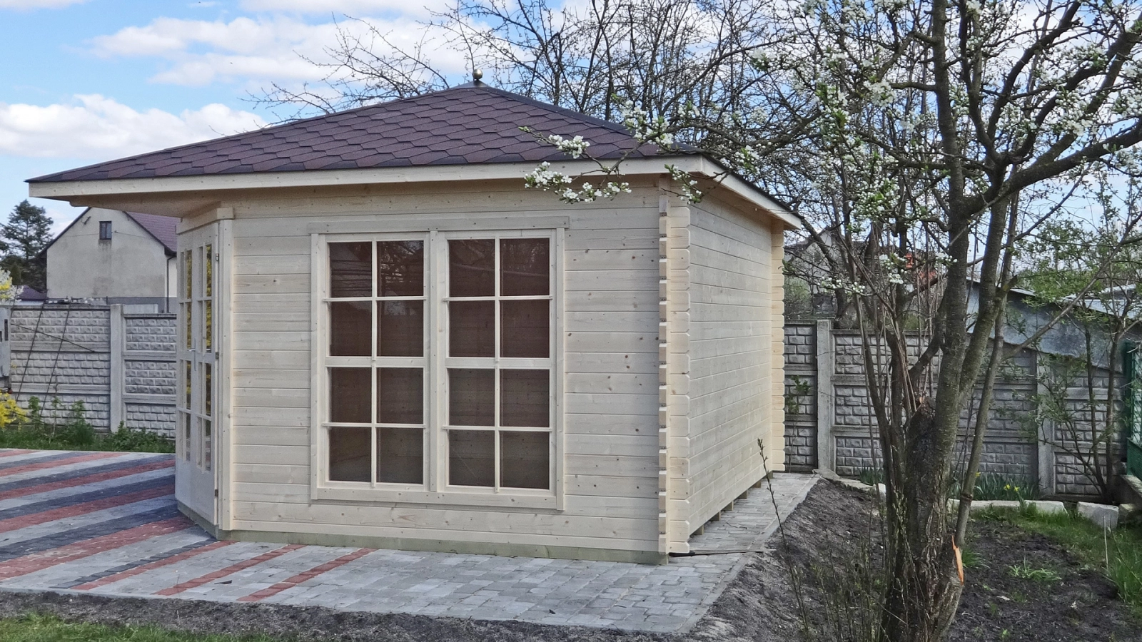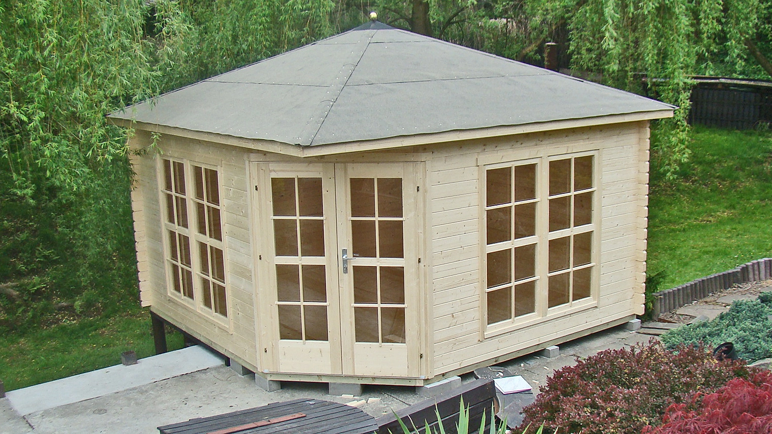 Drewniany domek pięciokątny Victoria C doskonale spełni rolę miejsca wypoczynku w zaciszu własnego ogrodu lub w ROD. Powierzchnia zabudowy daje możliwość budowy bez pozwolenia budowlanego.